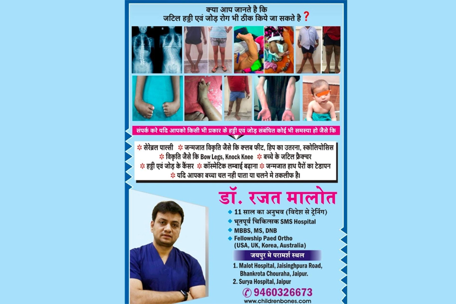 Dr Rajat Malot is a senior Paediatric Orthopaedic Surgeon working in Jaipur with experience of more than 12 years. He is running his own Malot hospital and private clinic along with attachments to Surya hospital, Manipal hospital and Birla hospital in jaipur. He has special interest in managing paediatric orthopaedic. He did his MBBS from SMS Medical College, Jaipur. After that, he subsequently did MS in Orthopaedics from the same medical college.He worked as Assistant professor in SMS hospital for 4 years He also worked in MEDANTA HOSPITAL, Gurgaon , Fortis hospital and Shalby hospital as a paediatric orthopaedic surgeon. He did his Fellowship in paediatric orthopaedics from South Korea with Professor Song. He visited Cincinnati Children's hospital in the USA as visiting surgeon. He also visited Paley Institute, the USA for deformity correction learning. Recently he visited Royal Children’s Hospital, Melbourne, Australia for advance technology learning.
